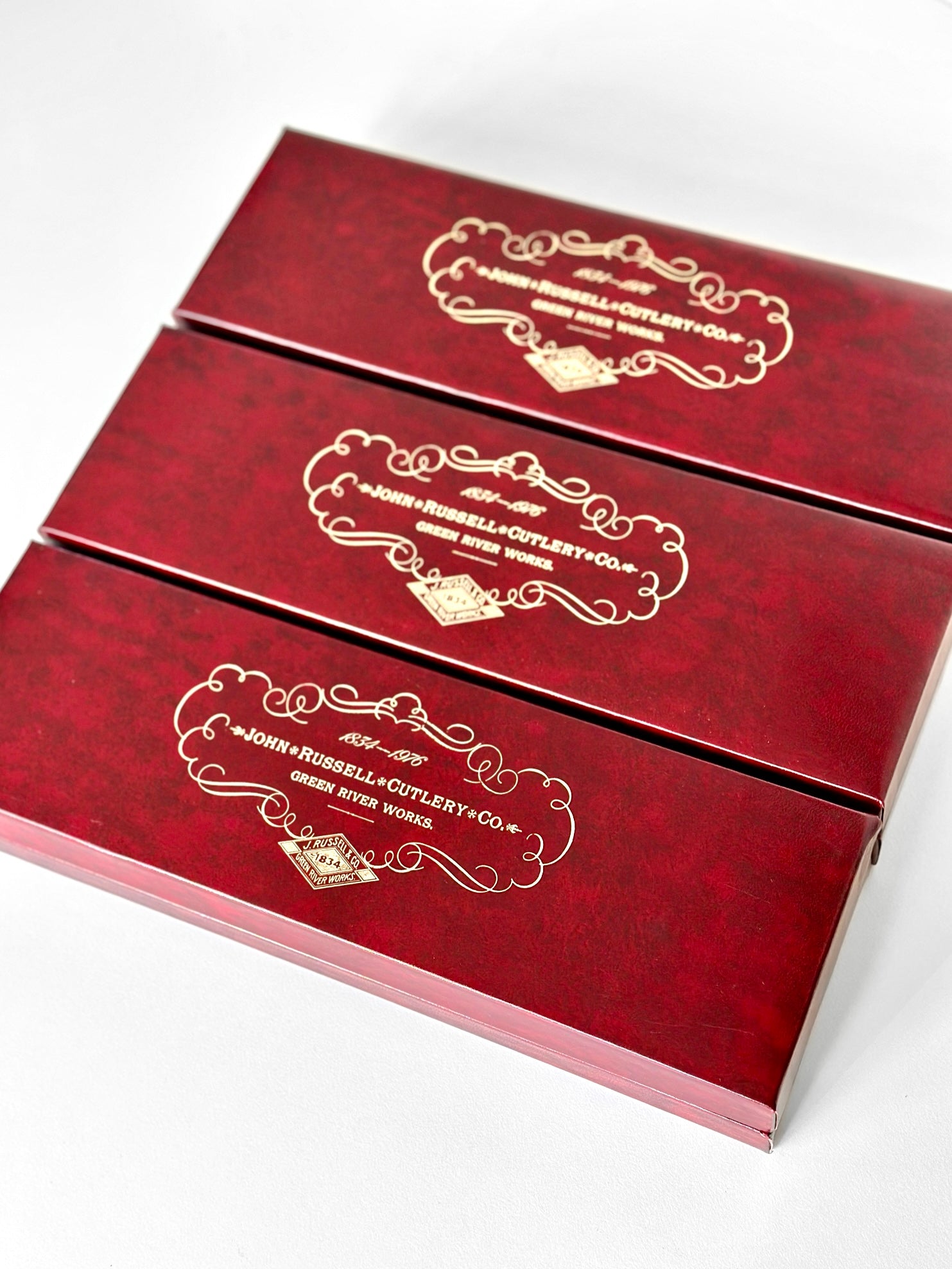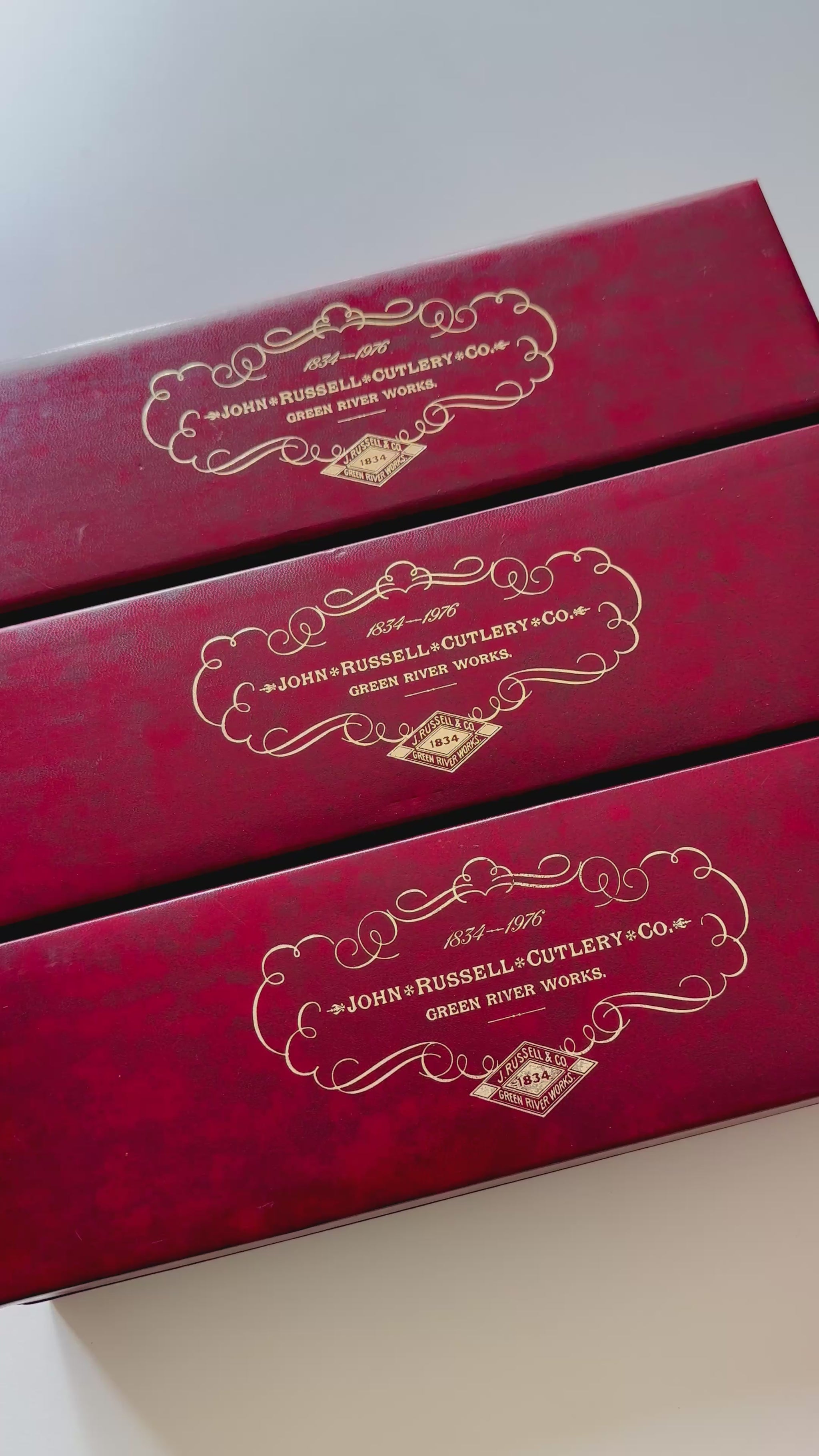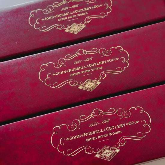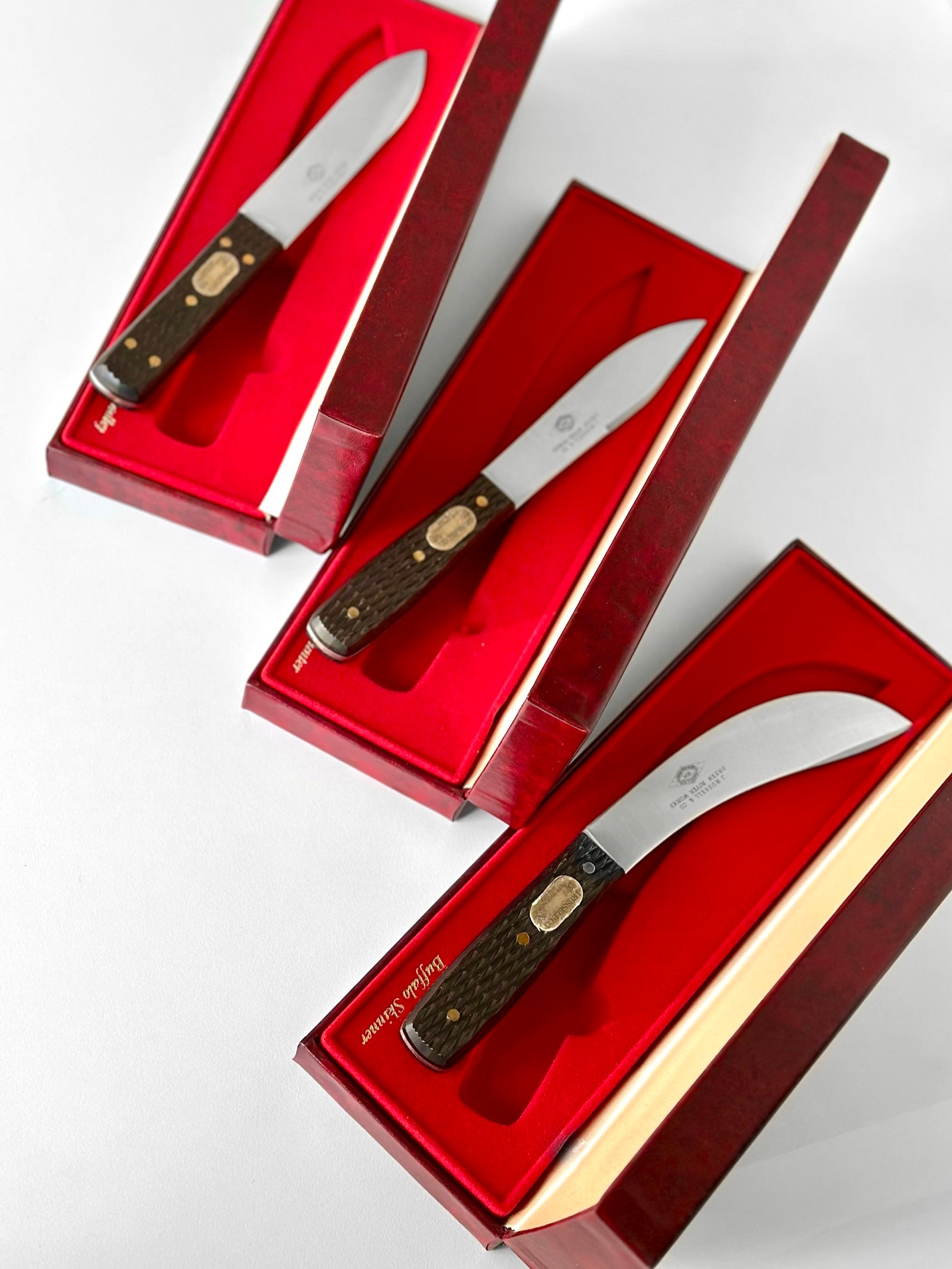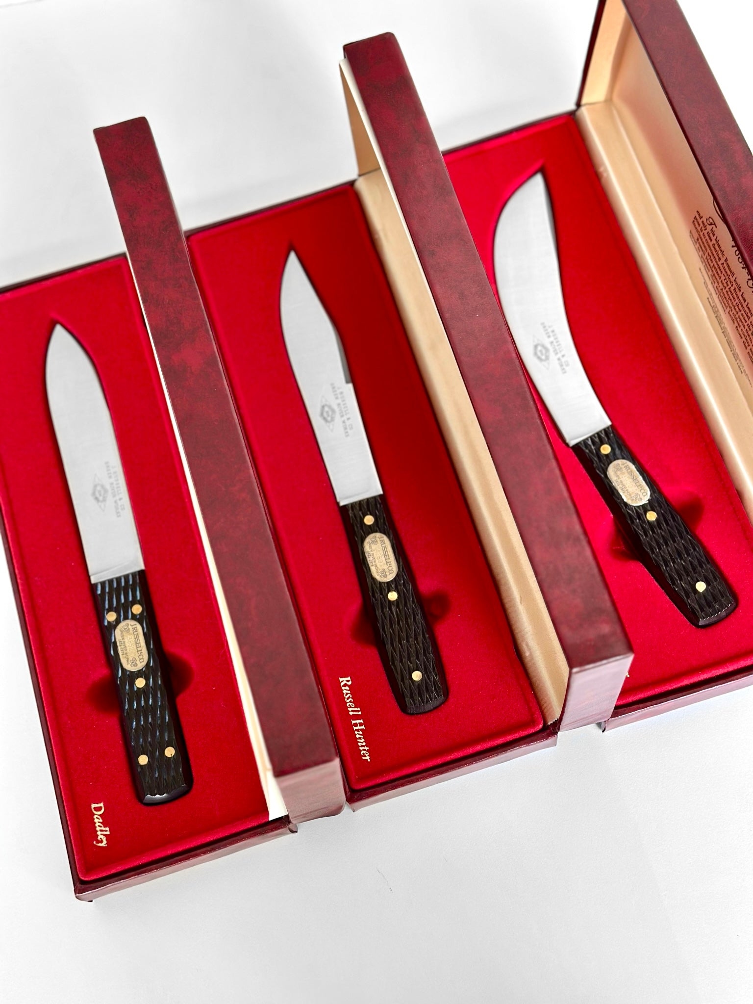 New Old Stock Limited Green River Set (circa 1976) featuring three historic Russell models: the Dadley, Buffalo Skinner & Hunter — recreated for the first and only time during America’s Bicentennial observance. The purpose is to commemorate “The knives that won the West,” as well as the frontiersmen who prized & depended upon them for their survival. Russell Harrington, America’s oldest cutlery manufacturer, is proud to present this serialized, collector’s set of Bicentennial Green River knives. Hybrid stainless high carbon steel blades w/ unused original factory edges and handsome jigged ebony wood handles w/ brass pins & inlaid serial number plate still sealed with a plastic film on top (serial numbers are not matching). Each knife is housed in its own original case. Unused mint condition. (This listing is for all three knives w/ original display boxes).