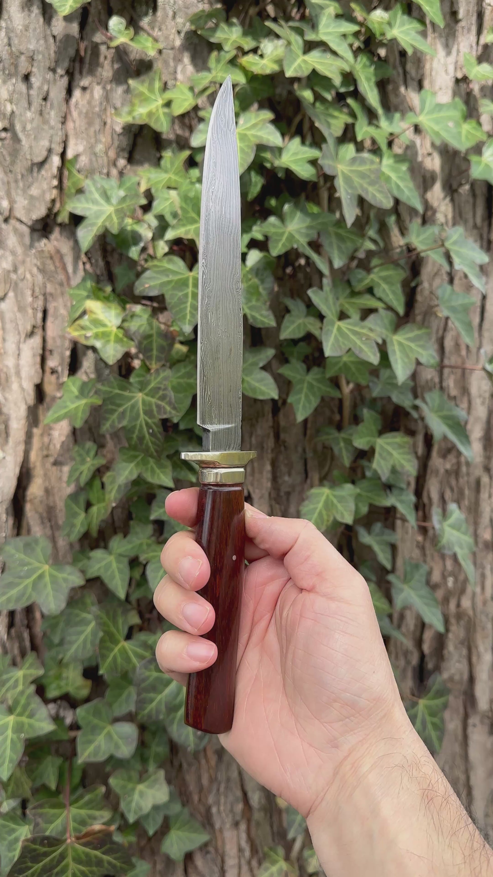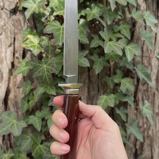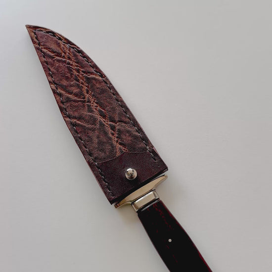 Custom Fighter by William Miller features a clip point Damascus blade, handforged in-house, with false top edge & fileworked spine, hidden tang construction. Full nickel silver guard w/ exotic snakewood handle. Includes the original brown leather sheath with elephant hide overlay. Excellent unused condition. SPECS: 7” blade, 12.25” OAL.