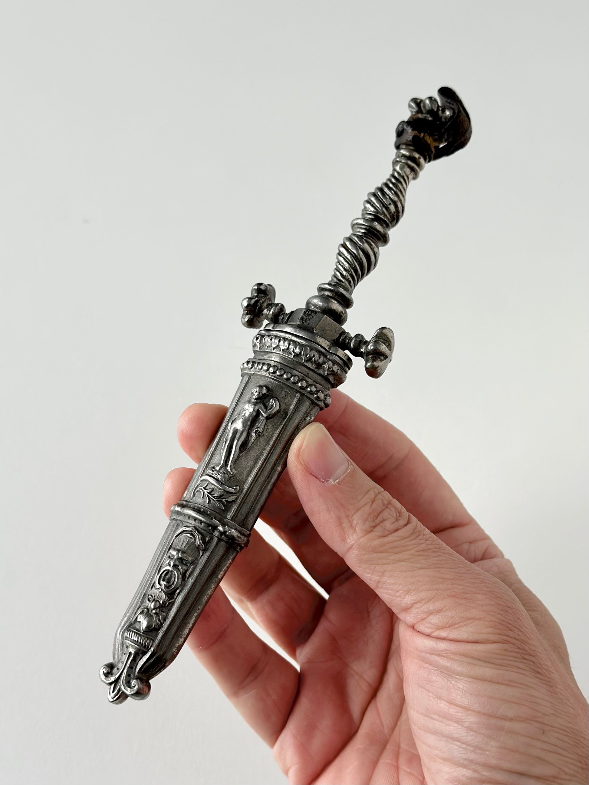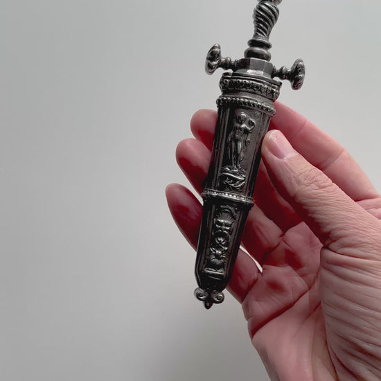 Antique Italian Cut Steel Dirk, circa 1840-60s, featuring a thick double-edged dagger blade, median ridge down the center, very sharp tip. The blade is almost quadrangular in shape, just a little wider than it is thick. All-steel handle with full steel guard, with scalloped large finials on the ends. Round twisted, spiraling, steel handle, with scalloped pommel, identical to the guard finials, with leather fastener attached to the pommel. Cast steel sheath, with nice tight fitting with wood or paper insert to receive the blade. The sheath is substantial, with low relief beaded throat, with nude woman on the top half and fearsome face below, with fleur de-list at the tip. This one is older than the more typical copper/brass versions. SPECS: 3.25” blade, 6.5” OAL, 7.25” OAL w/ scabbard. A museum quality piece!