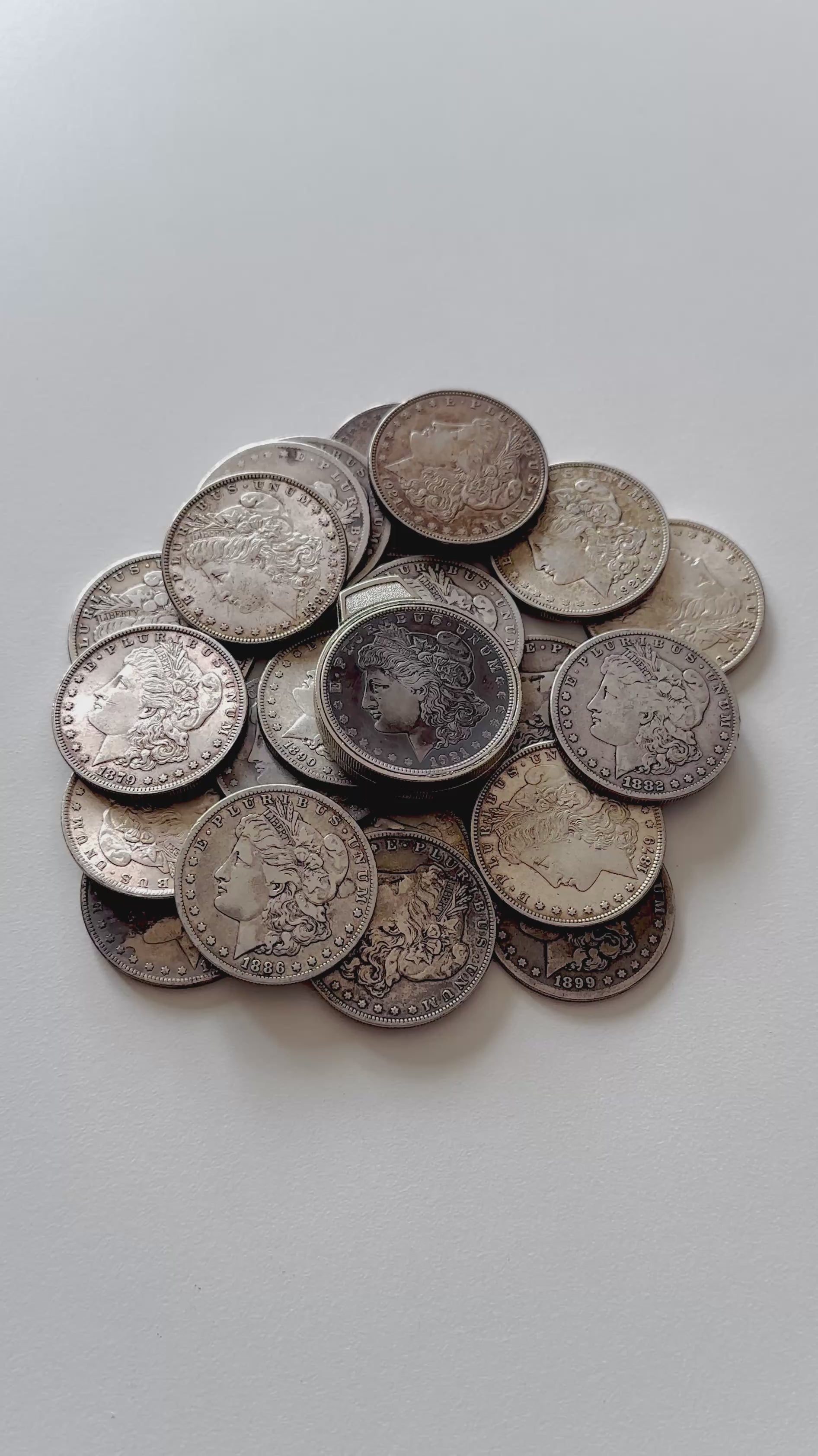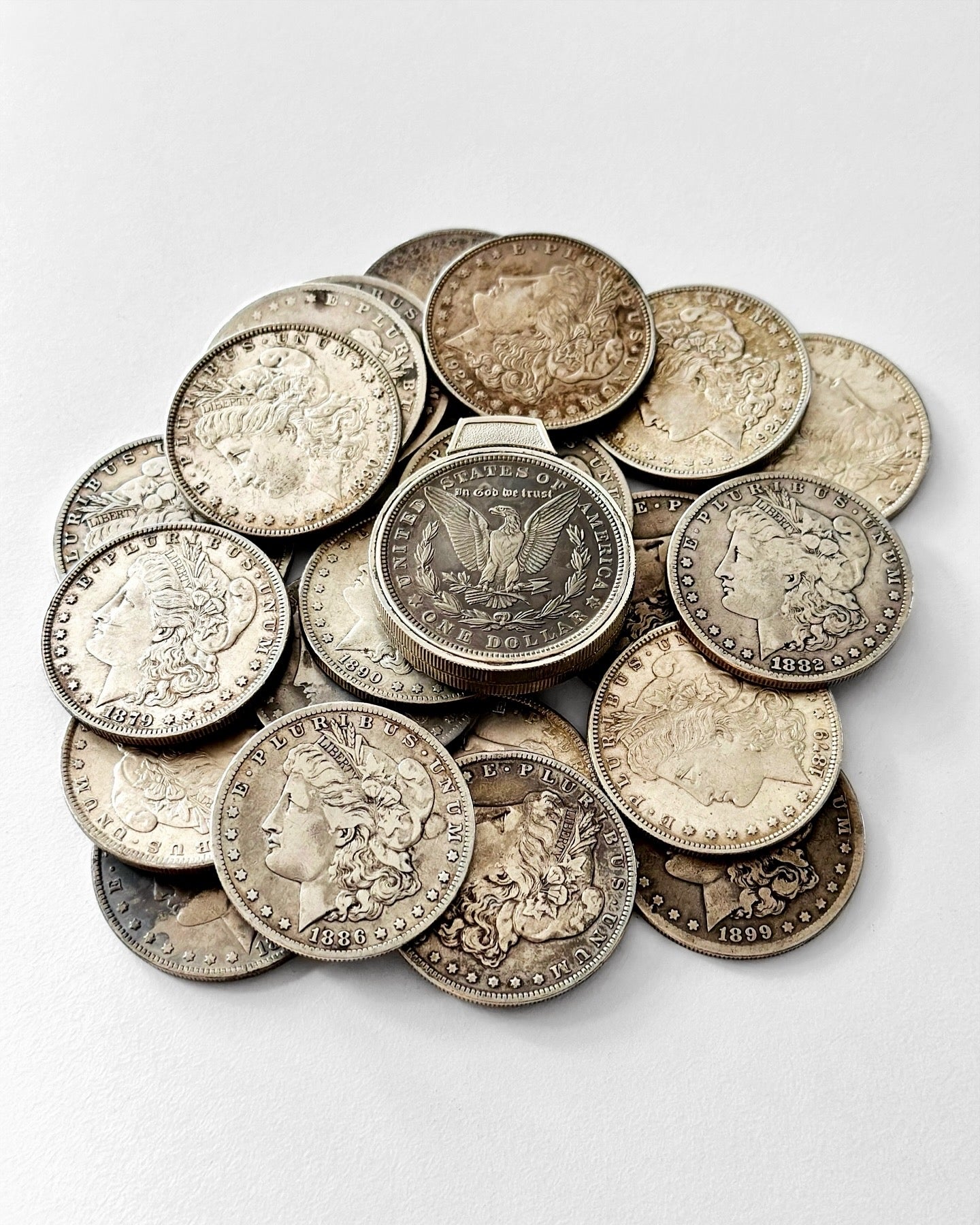 Restored Midcentury Beckwith Coin Lighter, featuring two genuine Morgan Silver Dollars (front & back), circa 1921. Beautiful dark patina, snappy flip-top with removable brass flint tube insert, a fully functional piece!
