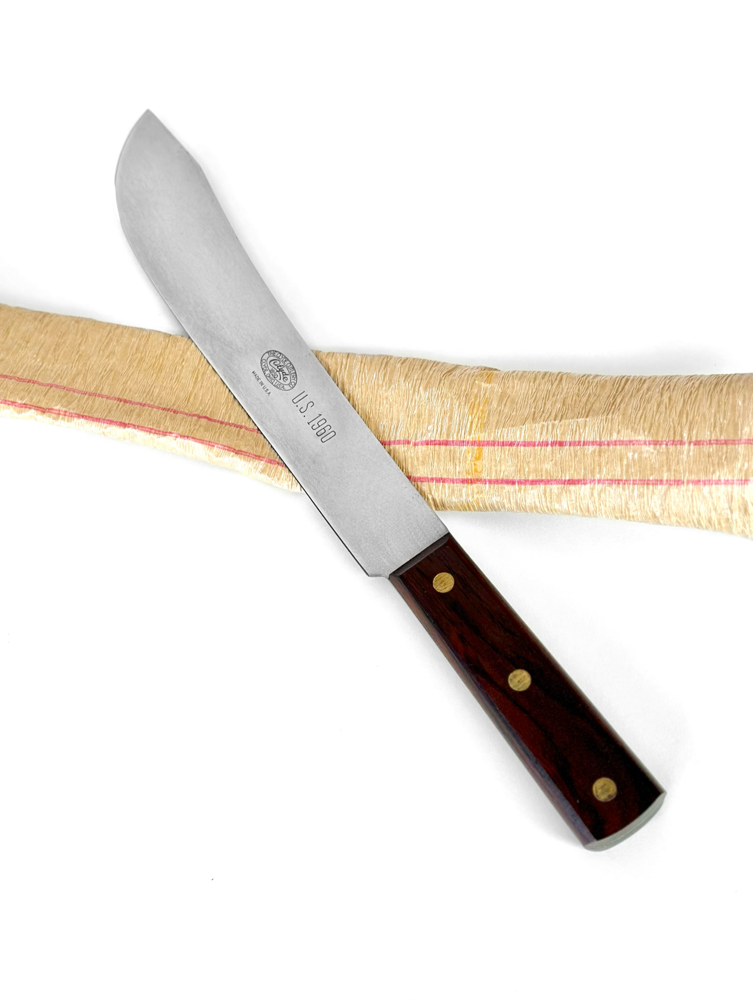 New Old Stock Vietnam War Era US Army-Issued 10” Clyde Cutlery Butcher’s Bullnose, circa 1960. Unused high carbon steel blade with razor sharp factory edge. Beautiful hardwood handle & large brass rivets. Mint condition. Includes the original wrapper.
