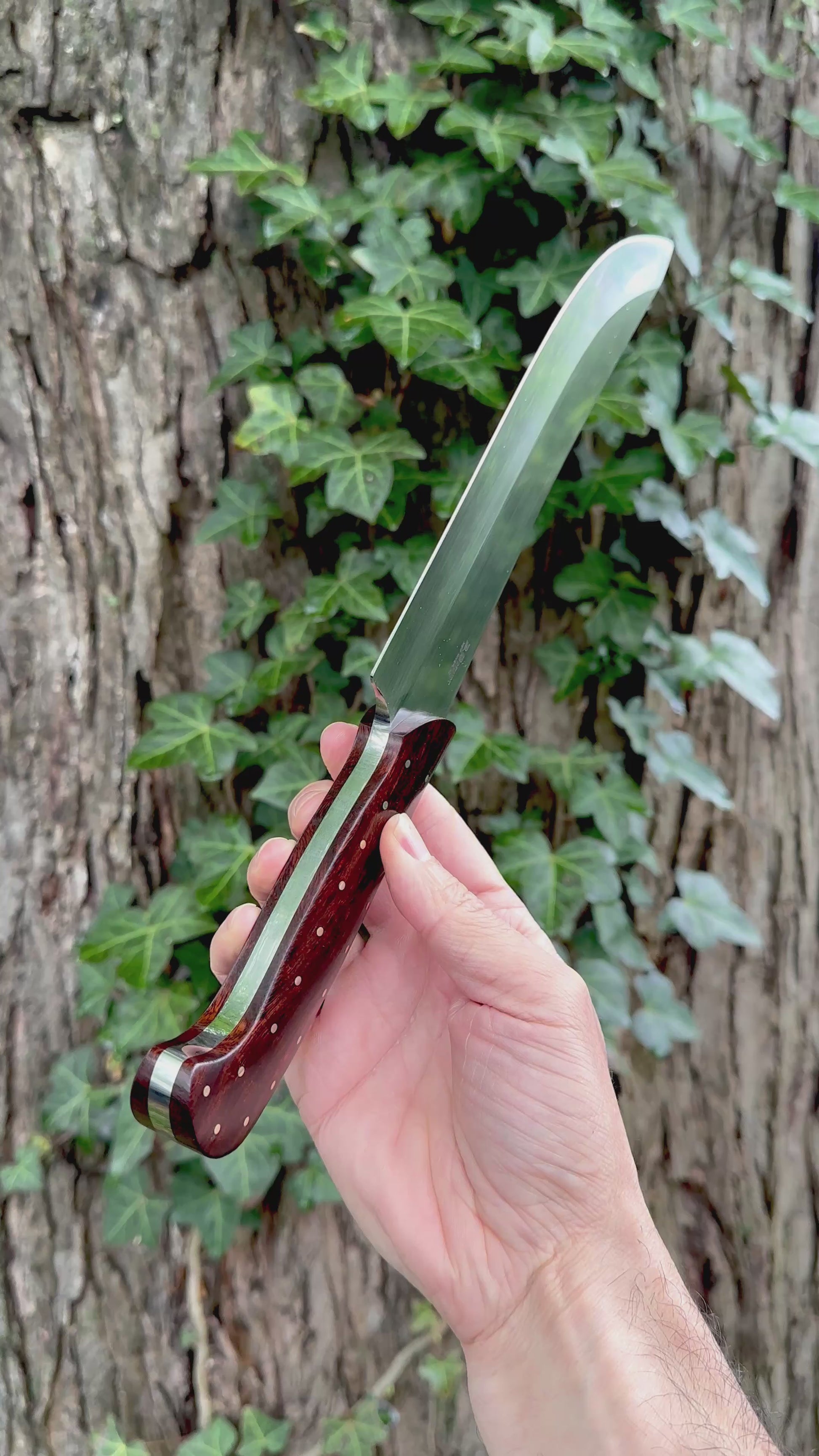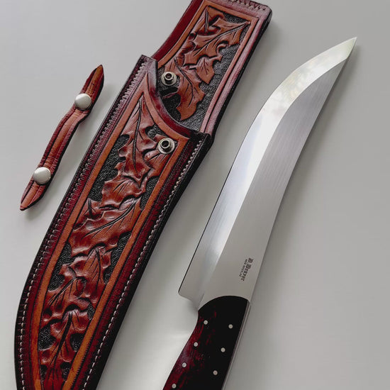 Vintage Custom Camp Knife, handmade by Devon “Butch” Beaver w/ custom sheath by Judy Beaver, circa 1990s. Featuring a large saber & hollow ground, upswept trailing point blade, hand rubbed satin finish, substantial ¼” thick stock, marked “D. BEAVER NEW RIVER, AZ.” Beautiful exotic burlwood scales, fully exposed straight tang, secured with nineteen steel pins. Excellent unused condition w/ original razor sharp edge! Includes the original, multi-tone, tooled & embossed upscale leather sheath with snap strap, handmade by Devon’s wife, Judy Beaver. A special one! SPECS: 8.5” blade, 14” OAL, weighs 1.5lbs w/ sheath.